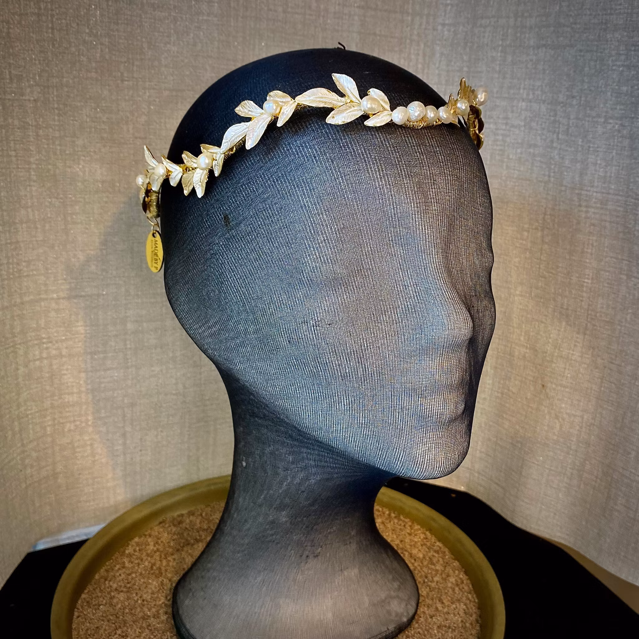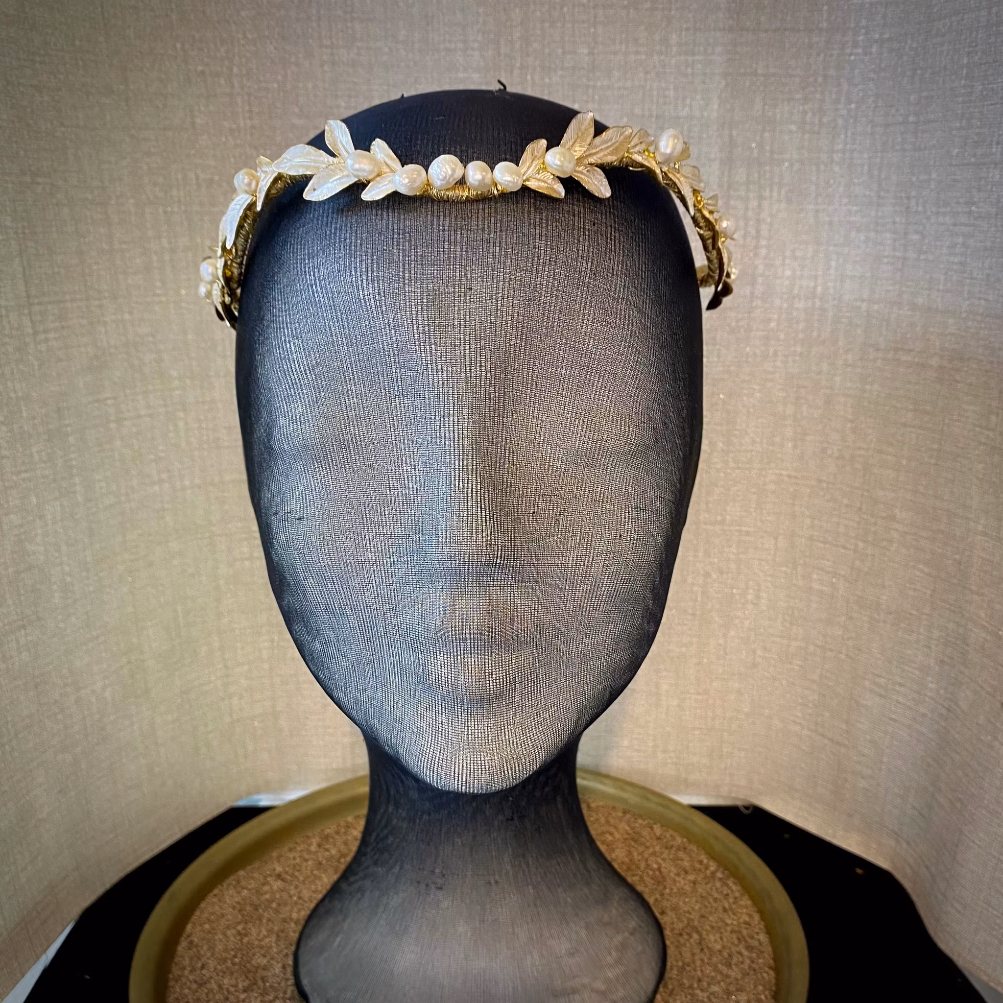 Ett handgjort hårsmycke som är "Fit for a Queen" Grenar/löv i smakfull pärlemofärg med vackra stora sötvattenpärlor runt om. Ramen och löven är i mässing och något formbart runt huvudet. Fästes med sidenband eller hårnålar.
